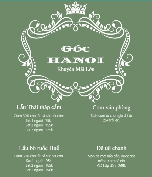 Góc Hà Nội" là một nhà hàng nằm trong chuỗi nhà hàng "Món Ăn Việt" ra đời tại Hà Nội với nhiều nhà hàng như "Huế Của Ta" "Ẩm Thực Việt. Tuy nhiên "Góc Hà Nội" tại 361 Trường Chinh là nơi các bạn có thể thưởng thức thực đơn đậm chất Á,Âu rất đặc sắc. Trong chuỗi nhà hàng "Món Ăn Việt", đây là nơi các bạn có thể thưởng thức thực đơn khiến bạn hài lòng. Đặc trưng ở đây là có cả các món ngon như...Xem chi tiết >>